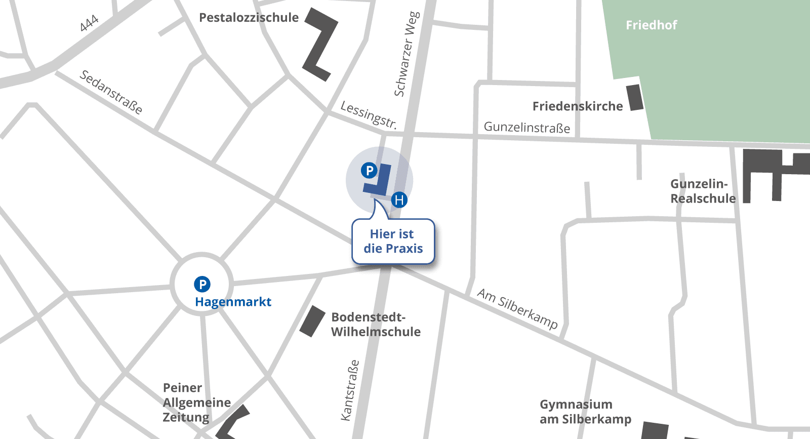 Sie finden an unserer Radiologie in Peine kostenfreie Parkplätze hinter dem Praxisgebäude. Die Zufahrt erfolgt über die Lessingstraße.